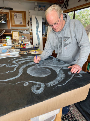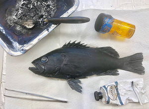 The fish specimen is prepared by cleaning it thoroughly and pinning out its fins, and is then covered with high quality, finely ground artists inks.